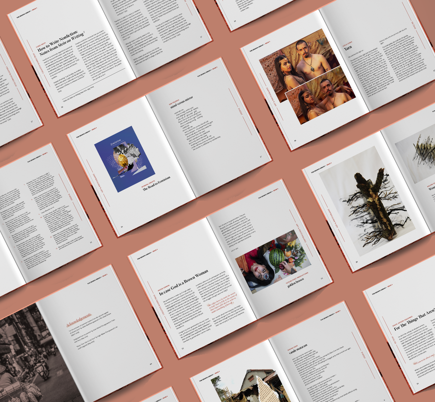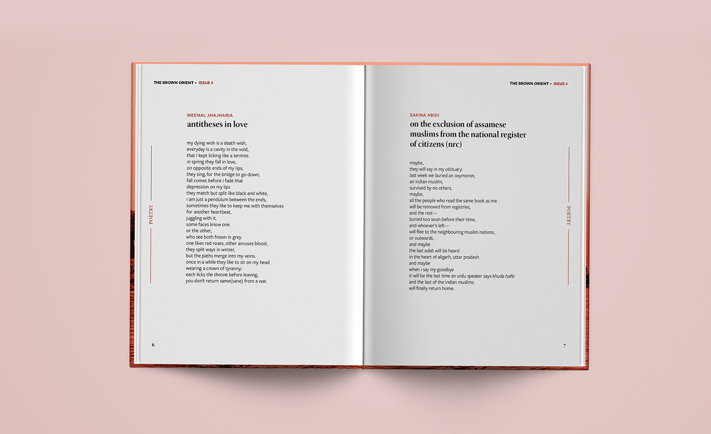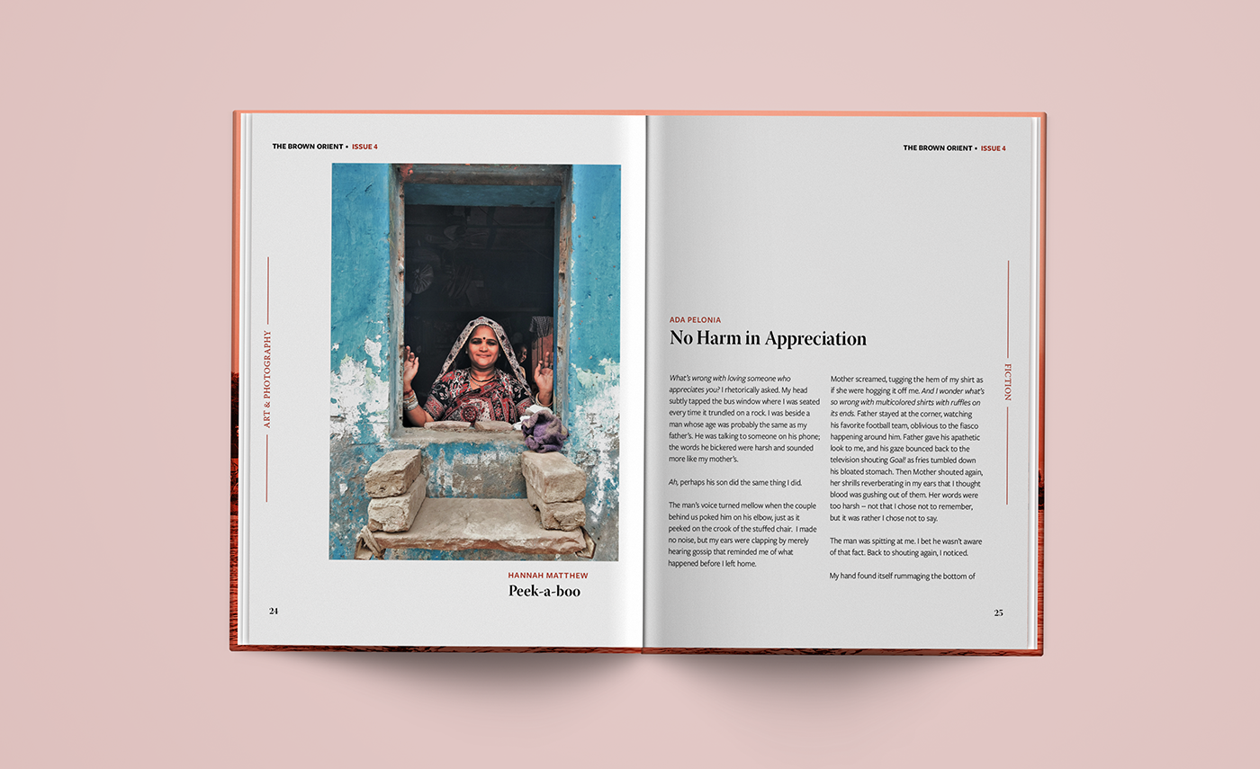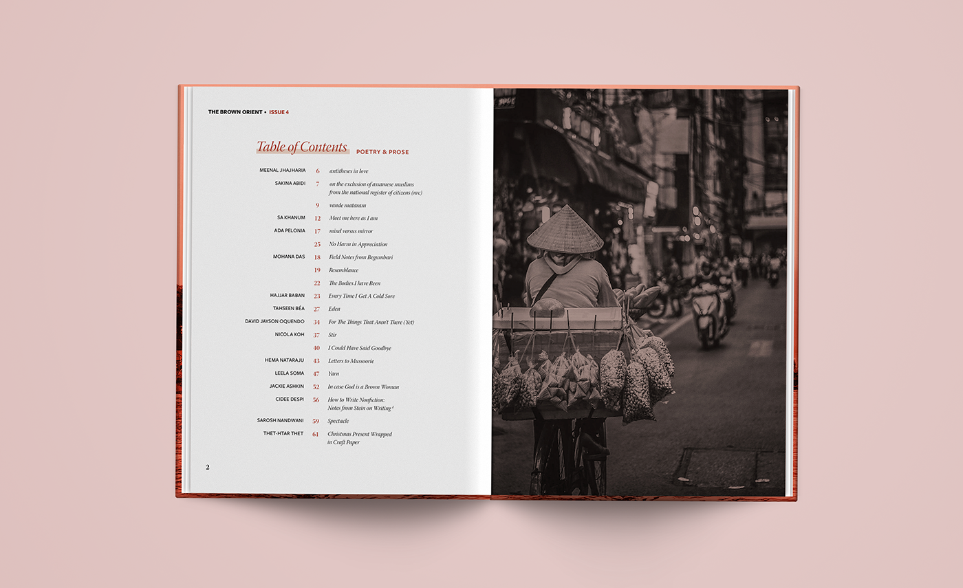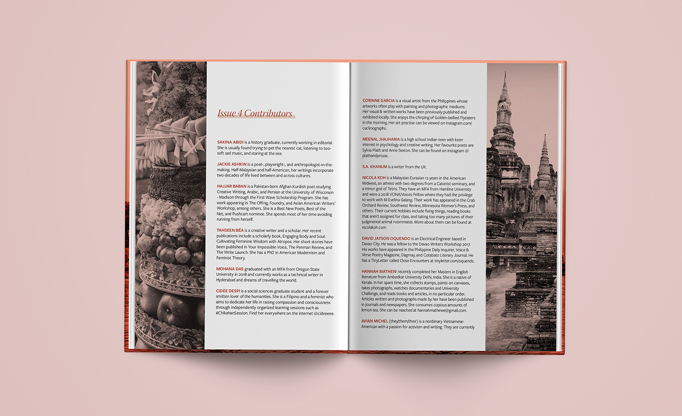 The Brown Orient is an independent arts organization & publishing house for women and queer folk from Central Asia, South Asia, Southeast Asia & Western Asia. Their Literary Journal is released in semiannual issues in print and digital formats. Prior to this issue, the journal was published in standard book format - my goal was to redesign the entire journal in preparation to begin releasing issues in magazine format. I was responsible for the full editorial design including front/back cover and all interior page layouts for Issue 4, which is a 76 page publication featuring poetry, prose, art and photography. The text and imagery shown within belong to their respective creators.